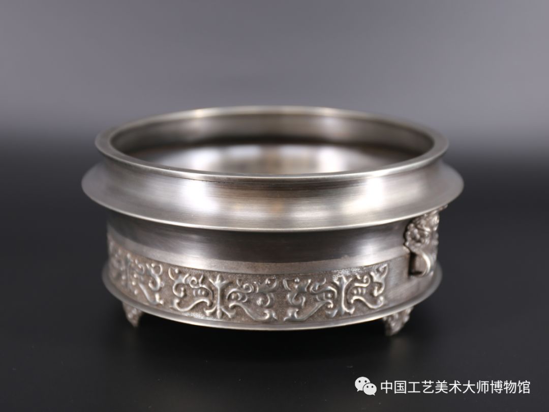 李宗泽设计并参与制作的锡制小水烟筒、笔筒、笔洗、花耳驴、唐马、曲烛台、牛顶罐七件锡工艺品被国家征集为一级珍品,永久收藏保存。此件《兽头纹饰水洗》就是其中一件。作品风格洗练,造型大气稳重。水洗上半部分环环相扣,起伏明显,无花纹装饰,光洁素雅;中部以立体兽头装饰作耳,实为点睛之处;下半部分以花草类浮雕装饰,底部有水浪纹饰的三足支撑,亭亭玉立,经久耐看。