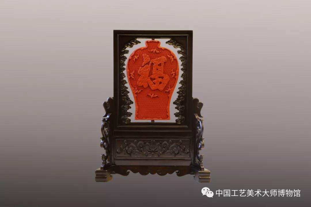 雕漆作品是用红色生漆经过调制成为“罩漆”,髹涂在胎型上,这必须在一定的湿度、温度和黑暗的窖室中进行。每天涂一至两道漆,一毫米的厚度至少需要15道漆的髹涂,待到达一定厚度才能进行雕刻。《福寿平安插屏》取材经典,由花瓶造型和“福”字组成,其中福字由梅花、兰草组成,精工雕制,不露斧迹,八只蝙蝠围绕“福”字由八个方向往中间聚集,寓意八方来福。周边一层层的浪花泛起波纹,外形以灵芝衬托陶瓷梅瓶的剪影。整件作品寓意福寿平安。