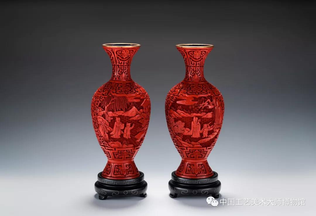殷秀云雕漆设计水平高超,雕刻技艺精湛。她尤其擅长人物题材剔红作品设计创作,在人物的神情、动态、以及故事情节的构思设计上都有自己的独到之处。其创作技法基于雕漆技法的同时并融入牙雕等立体雕塑技法和表现形式,开创了以人物题材为主的雕漆作品风格。《访友图对瓶》胎体采用铜胎,上数遍漆后雕刻而成。作品选用的是山林访友人物题材,图案装饰与造型完美契合。瓶身造型优美,曲线流畅、亭亭玉立,前后两面最突起的部分分别有两组人物,且各不相同。人物虽只有两三厘米高,但神情生动自然,情景呼应,意境幽远。漆面呈现出荧光润泽,色彩鲜艳沉稳的效果,是经典的雕漆剔红作品。