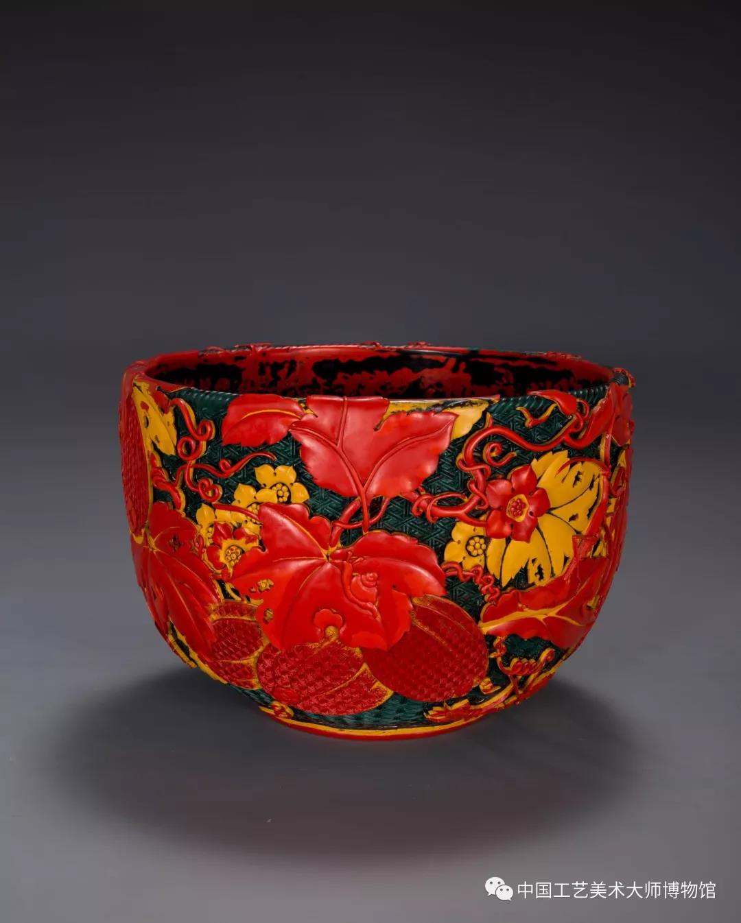《硕果》在铜胎上进行艺术创作,通体髹红、黄、绿三色天然大漆,髹漆肥厚,雕瓜果虫纹饰,剔彩工艺突出作品的空间层次关系,叶子上雕有螳螂、蚂蚱,甚至还有虫蛀的叶脉,使作品更为生动、鲜活。硕果上体现了多种雕漆锦文的雕刻特点,寓意秋天丰收的树上果实茂盛,象征欣欣向荣、蒸蒸日上。