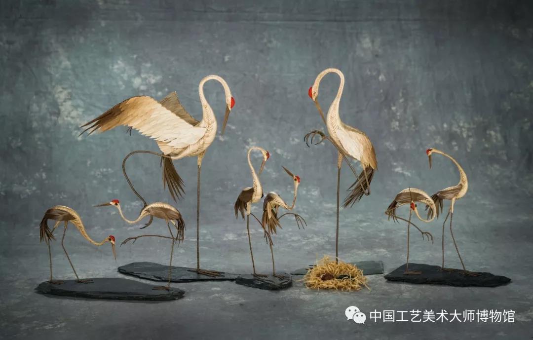 作品《丹顶鹤》分别塑造了十一只形态各异的丹顶鹤, 有的欢呼良自适,罗列好相依;有的双舞庭中花落处,数声池上月明时;有的惊身蓬集,矫翅雪飞。丹顶鹤玉羽霜毛之上还具有一个渥(朱)顶、丹砂,显得典雅而风流。工艺方 面集中 了棕编工艺中体积与平面处理的优势,体、面、线的有机构成较好地体现了棕编材质与造型方面独特的美学;造型上生动地表现了丹顶鹤的优美、高洁。