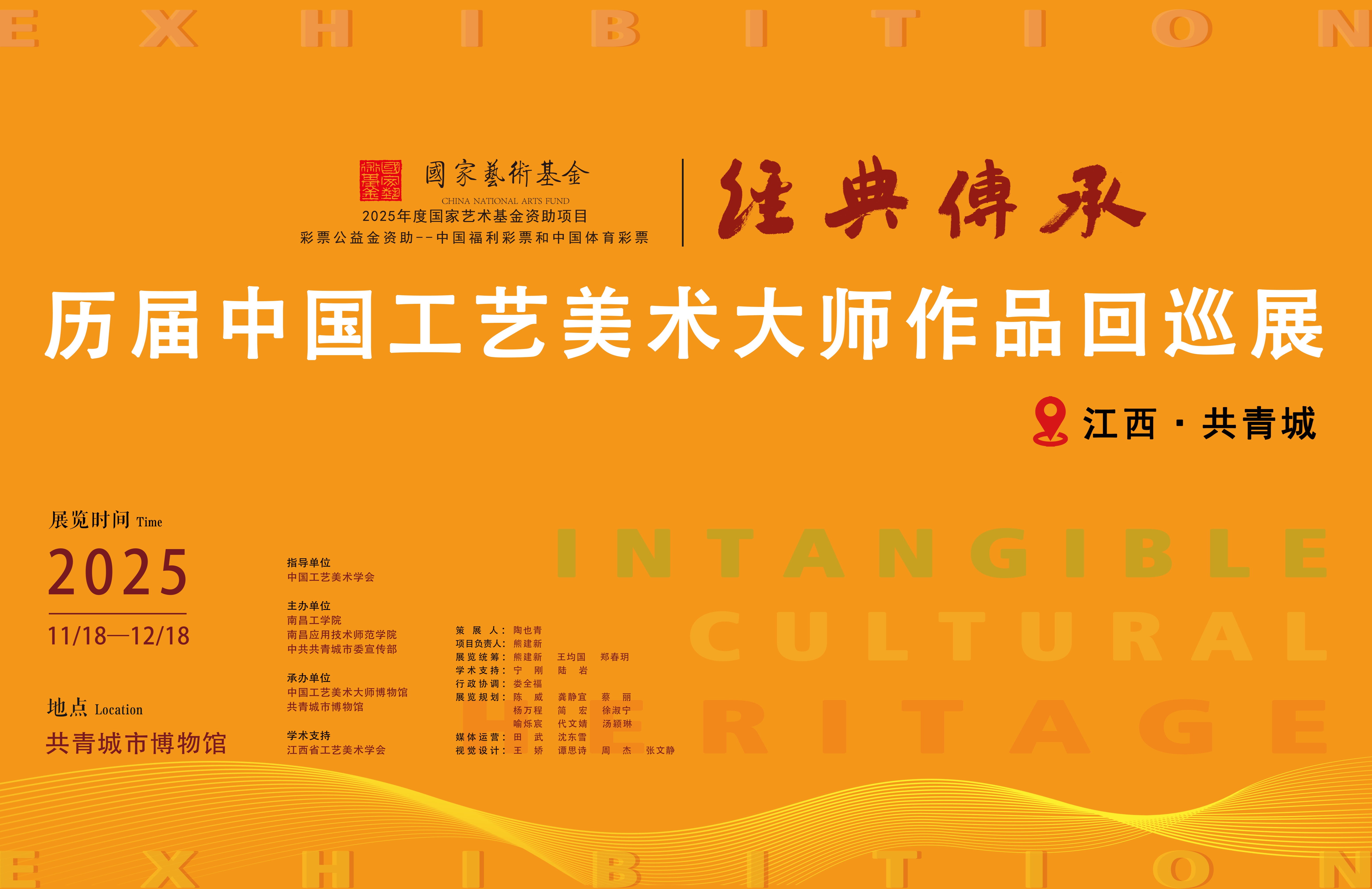 展览主题: 国家艺术基金资助项目 彩票公益金资助——中国福利彩票和中国体育彩票 《经典传承——历届中国工艺美术大师作品回巡展》共青城站 展出时间:2025年11月18日至2025年12月18日 展出地点:共青城市博物馆11-15/ 2025本馆活动