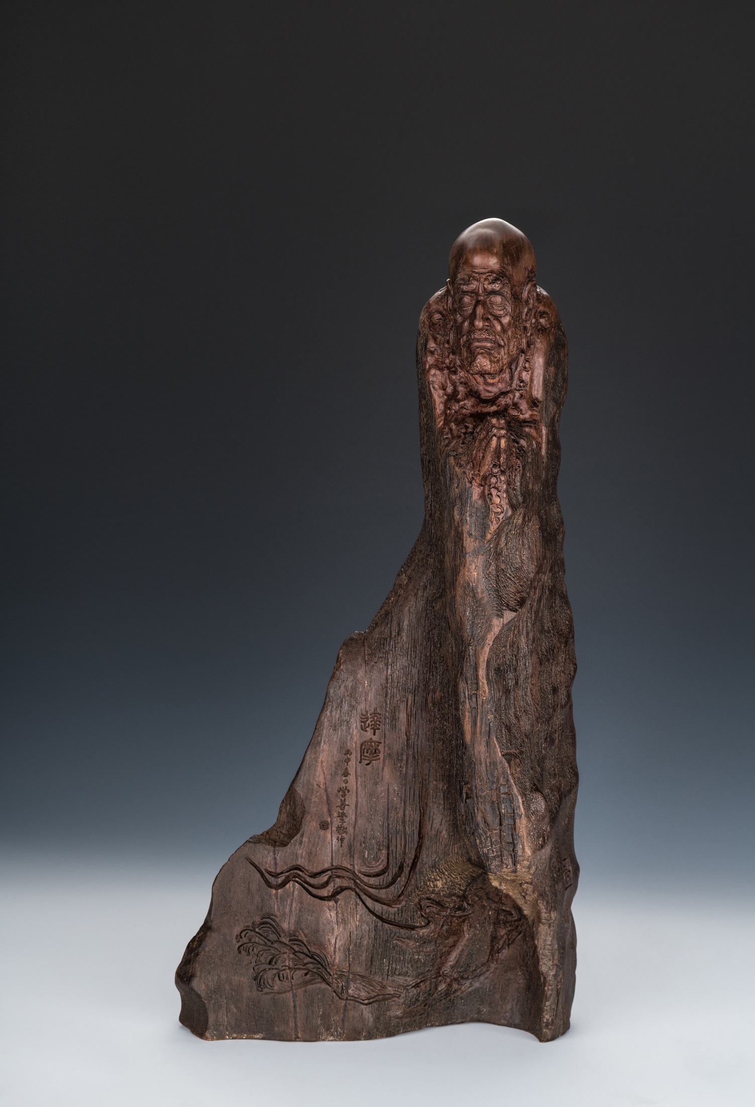 林学善融传统雕刻技法与写意国画为一体,大胆运用中国画虚实相生的原理构思,擅长因地取材雕刻达摩题材。作品《达摩》材质为阴沉木,人物雕刻因材施艺,结合木料的自然形态,取其最佳态势,充分保留自然美。此件木雕作品同样是运用了林学善较为典型的表现手法,采用了“写实”的雕刻手法重点雕刻达摩头部,工整细腻明快,乃至于骨肌相应、表情丰富。作者又以“写意”的手法,取材质自然形态,为达摩量身定做了一件袈裟。袈裟自肩部自然垂落,褶皱围落平铺于达摩身躯四周。人工雕刻与自然形状达到了天人合一,总体法相庄严,肃穆传神。