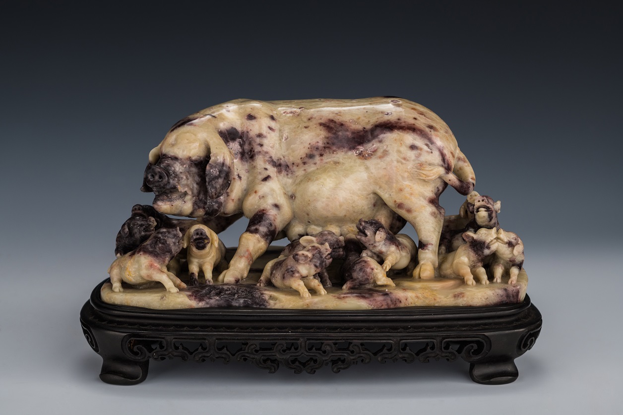冯久和擅圆雕,尤以雕刻群猪等动物作品著称。猪,在中国传统文化历史上是财富、吉祥的象征。作品《合家欢》刻画的是十二头活泼可爱的小猪围着猪妈妈争先恐后吃奶的情景。小猪崽或昂首“哼哼”叫嚷着、或叼着母亲的乳头咂咂吮吸、或在一旁干瞪眼......画面情趣自然、惟妙惟肖,这有赖于冯久和世居农村、熟谙农家事这一扎实的创作基础和生活经验。此外,作品对巧色的利用和处理堪称一绝,他不为“俏色”所束缚,而是用自己的艺术语言驾驭“俏色”,为寿山石雕的“因色取巧”的技艺开拓了更高的创造空间。
