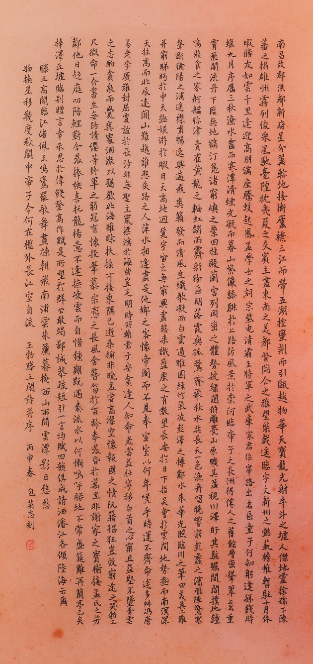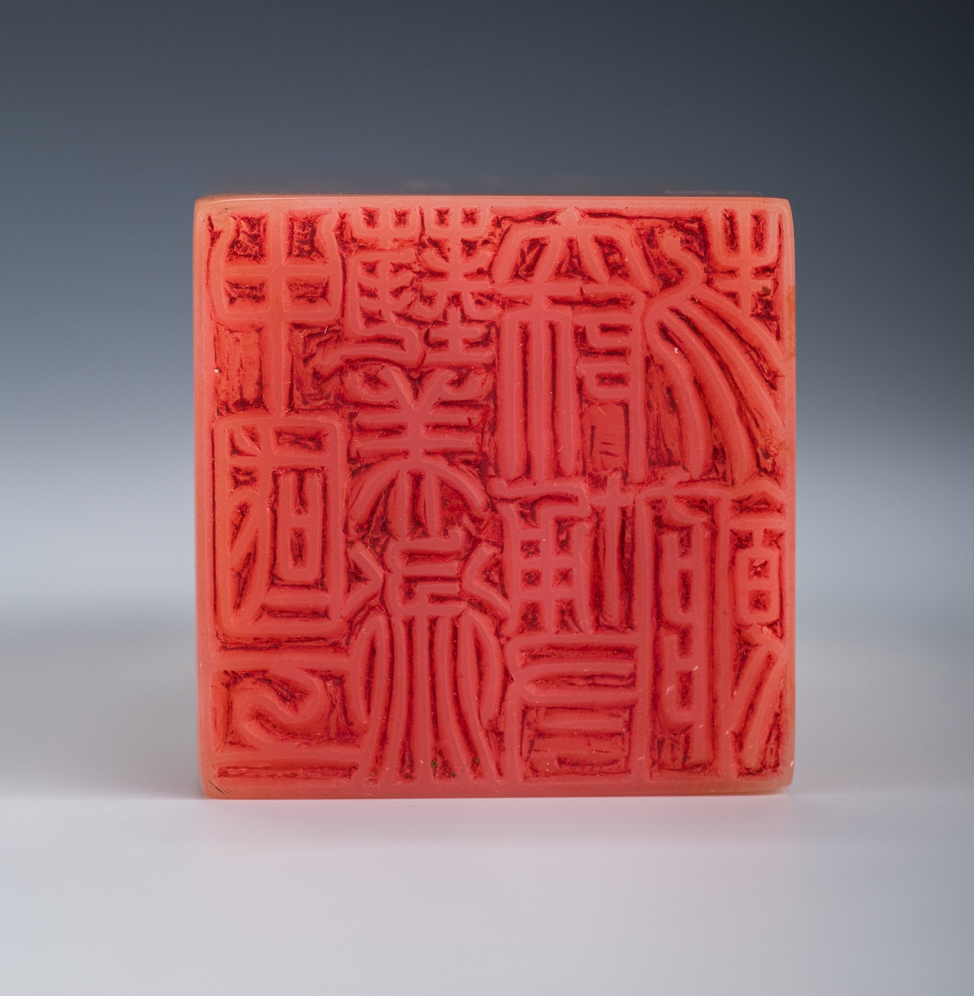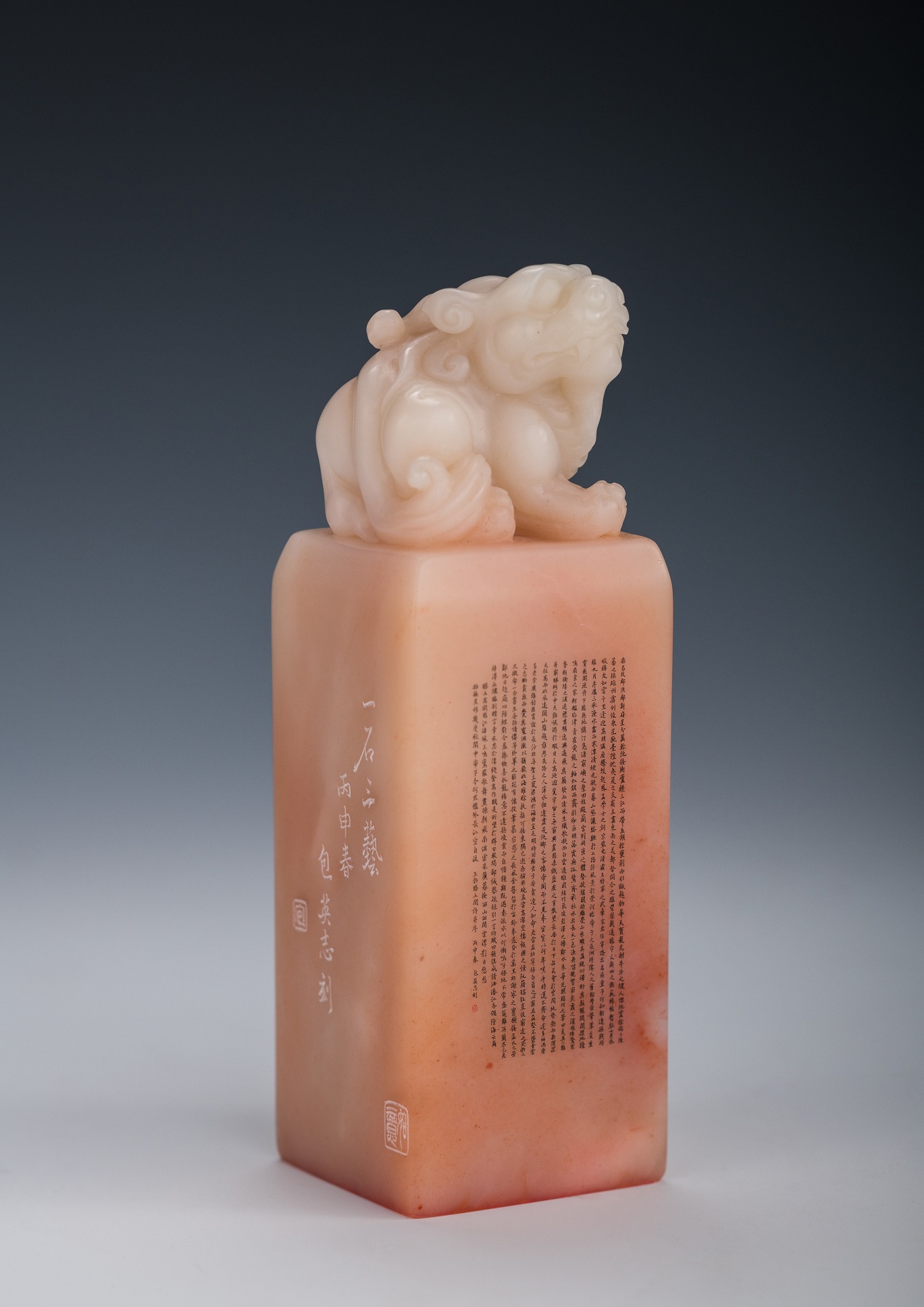 微雕是浓缩集中国传统文化精华的精微艺术,是雕刻技法的一门分支,微雕一般指微细的圆雕、浮雕和透雕等。它甚至可以在米粒大小的象牙片、竹片或数毫米的头发丝上进行雕刻,其作品要用放大镜或显微镜方能观看到镂刻的内容,故被称之为神雕意刻。包英志擅长在石、和田玉、竹、金、银上进行微雕。 《滕王阁序》印章为名贵的巴林粉冻石方章,质地细腻润泽, 色泽纯净,为巴林石中精品。印钮以圆雕的技法巧色雕刻出一瑞兽仰天长啸,其造型浑圆饱满, 形态雍容大度,雕刻细腻精美。边款微刻王勃《滕王阁序》,共766字,每字在0.6毫米左右,放大200倍观之, 字体端庄挺拔, 遒劲爽利,金石趣味盎然。铁笔微刻,关键之处是通过行刀时的轻重、徐疾进行精微掌控,来体现书法虚实浓淡的笔情墨趣,微刻运刀起行转收在毫厘之间,目力不可能全窥,全凭作者调心息念,用独家心法运气注力于锋刃,才能从心所欲。 印面篆刻“中国工艺美术大师博物馆”,朱文。结体端庄,布局疏密有致,刀法以冲刀为主,简洁明快。