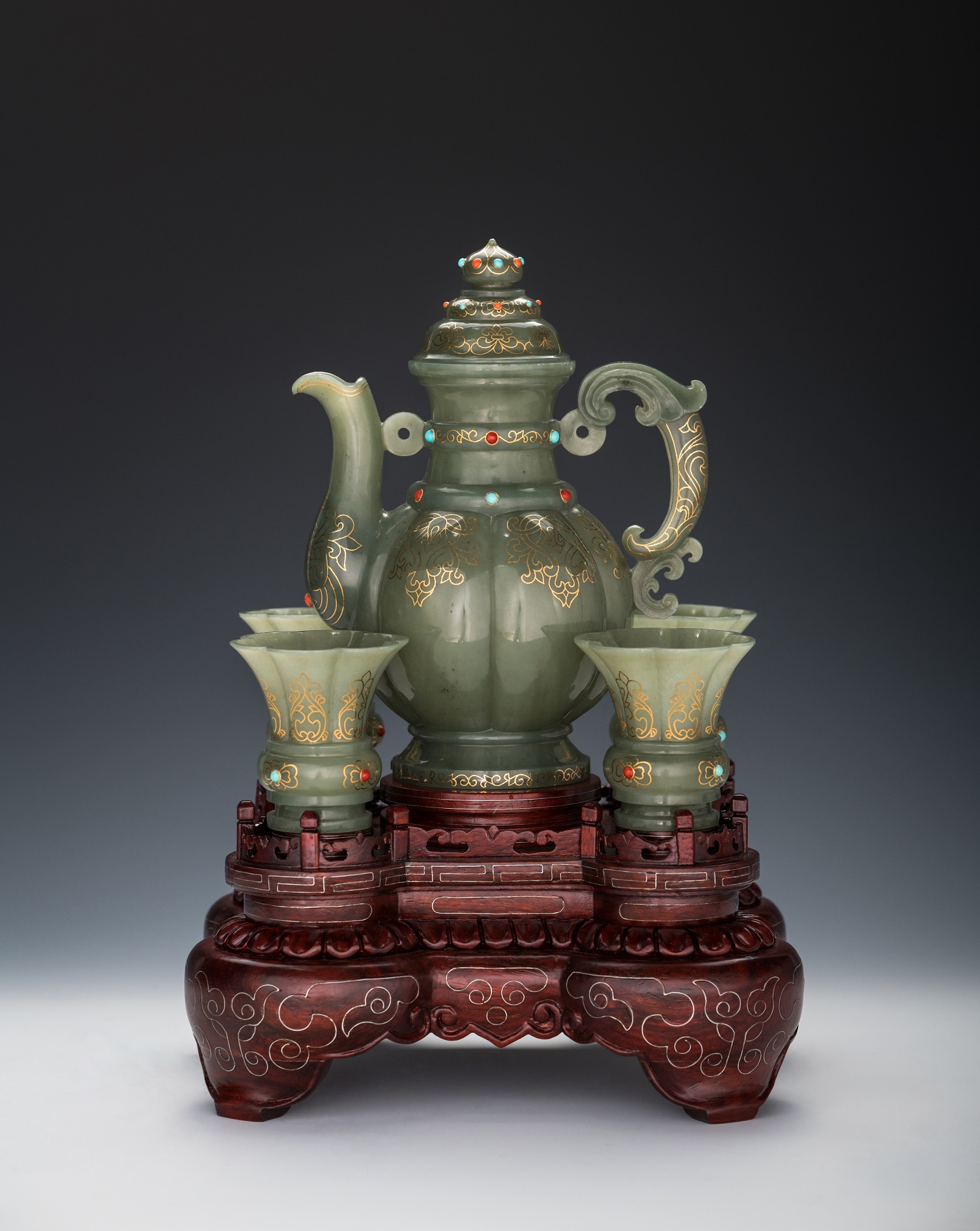 金银错工艺最早始见于商周时代的青铜器。其表现手法为在器物表面上绘出精美图案,依图案之形錾出槽沟。将纯金或纯银拉成细丝或压成薄片嵌入图案中,而后打磨平整,抛光磨亮。使所表现的图案与被嵌物品形成强烈的色泽差别和耀眼的金属光泽,显得更为突出、雍容华贵、绚丽多彩。马进贵将金银错与玉雕工艺相结合,创作出了全新的玉雕艺术品。 《阿布都瓦壶》包含一壶四杯,“阿布都瓦壶”即为“汤瓶壶”,鹅脖壶嘴,人耳形壶把儿,壶身上小下大,线条流畅,为典型的波斯器皿造型。作者将金丝、宝石镶嵌于在玉器上,对其进行适当的装饰、点缀,不多不少,恰到好处。