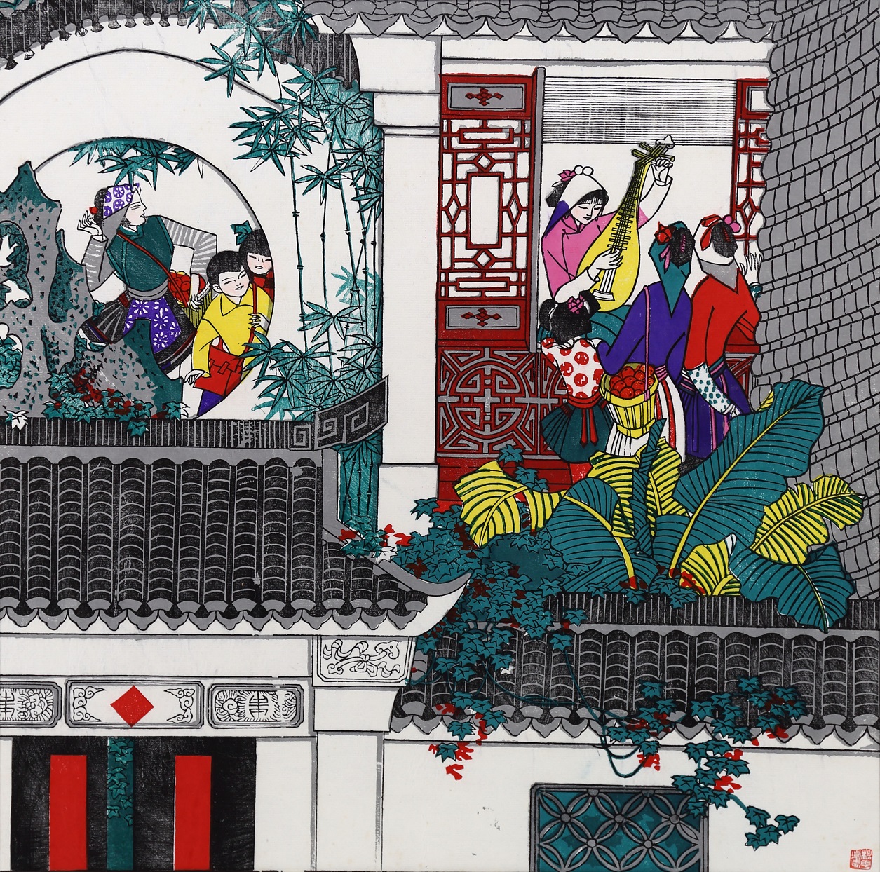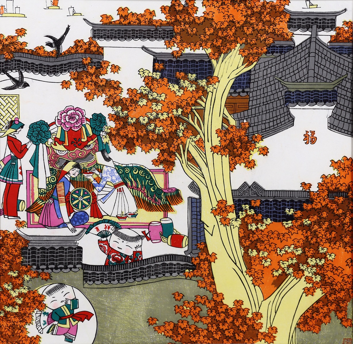 桃花坞年画因集中在苏州城内桃花坞一带生产而得名,与山东潍坊杨家埠年画、四川绵竹年画、天津杨柳青年画并称“中国民间四大木版年画”。它源于宋代雕版印刷工艺,由绣像(书籍的插图)演变而来,主要有创作、刻版、印刷三道工序,其中每道工序又包含很多繁复的手工技艺。从久远历史中走来的桃花坞年画,送走一个个旧岁,迎来一个个新春,寄托着吴地百姓祈福的夙愿,演绎着苏州民俗百态的变迁。《水乡四季》以苏州小桥流水,黑瓦白墙,枕河人家,村姑服饰,民风民俗,四季变化为主要题材,再现了桃花坞年画的轻灵细腻,饱含着水乡姑苏的温婉柔情,既体现了年画的质朴,又有很高的艺术趣味。