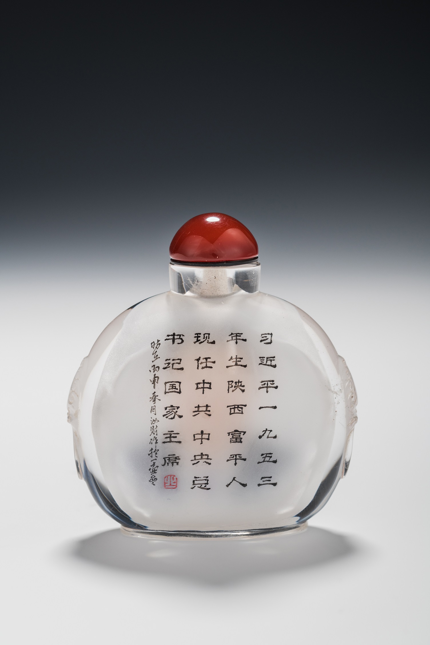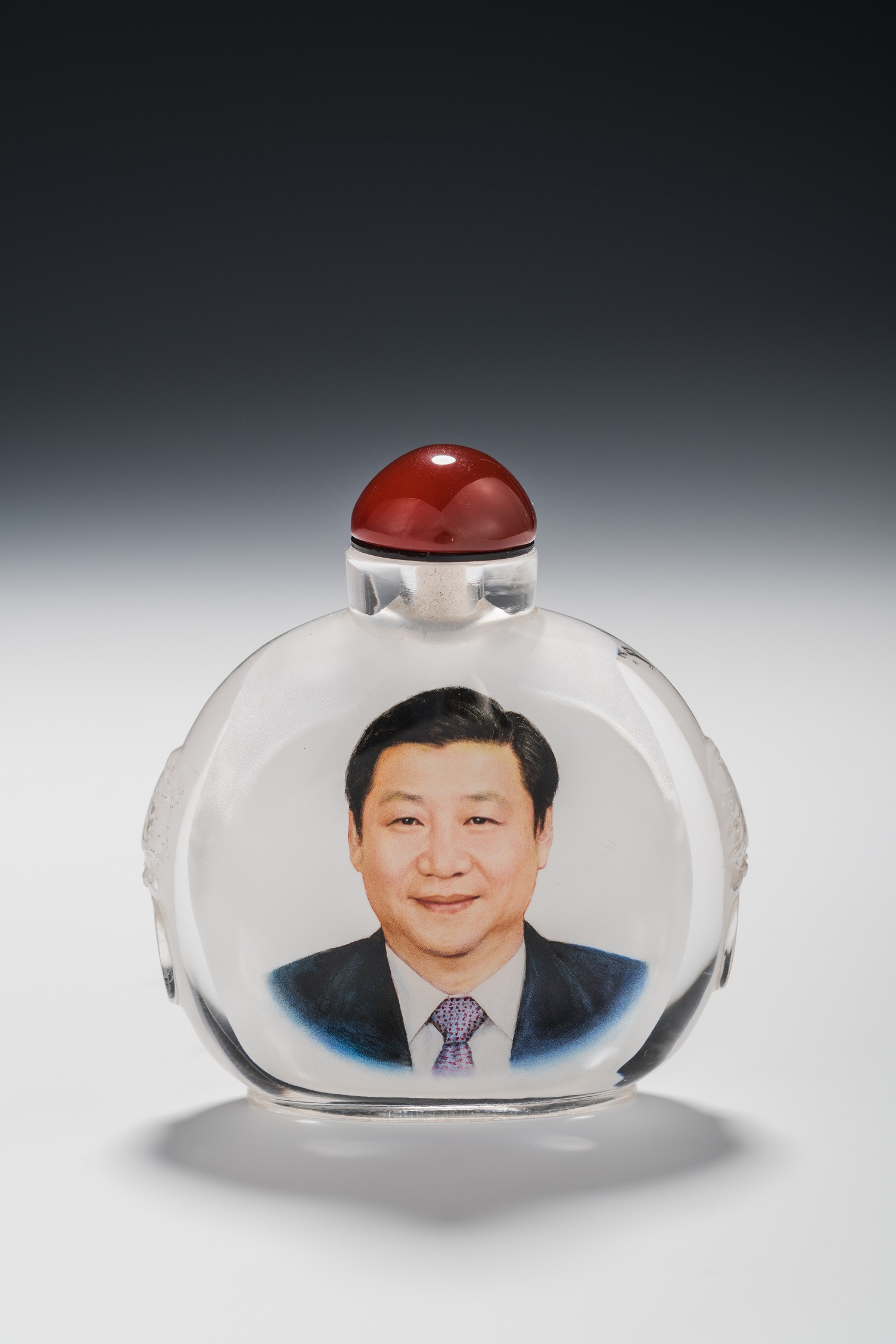 衡水内画是一种鼻烟壶内壁绘画技艺,其工艺精湛,“寸幅之地具千里之势”,如同鬼斧神工,被外界认为不可思议。张汝财经过刻苦钻研,在这方寸之地里游刃有余,渐渐达到难之不难的境界。他擅长绘制肖像,此件《习近平肖像》以“中西合璧”油彩画法,明暗关系富于变化,色调明快,以中国肖像之勾线平涂法为主,面部着色吸取西洋画法,突出光线变化,使画面柔和细腻,精工细作,透视准确、气韵生辉,有如彩色照片。人物线条流畅、形神兼备、层次分明,用笔有力、古朴、浑厚、雅俗共赏。
