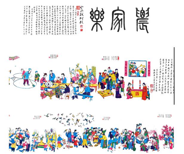 杨家埠木版年画以浓郁的乡土气息和淳朴鲜明的艺术风格而驰名中外,是民间木版年画三大产地之一。数百年来,杨家埠木版年画按照劳动人民的思想要求、风俗信仰、审美观点、生活需要逐步发展完善,形成了自己古朴雅拙、简明鲜艳的风格。年画《农家乐》以古代中国自给自足的自然经济为背景,将古代农民一年四季主要的劳作、游艺、节庆、礼仪活动创作并雕刻成531面画板,手工水印在一张3200×50cm的无接缝宣纸上。内容分为春、夏、秋、冬和闹新春五部分,从“双喜临门”开始到“闹新春”,系统的描绘了当时农民生产、生活、交易、节庆、礼仪、文化、娱乐活动等。整部画卷内容详实、结构严谨,场景宏大,人物刻画生动,有“中国木版年画之最”的称号。