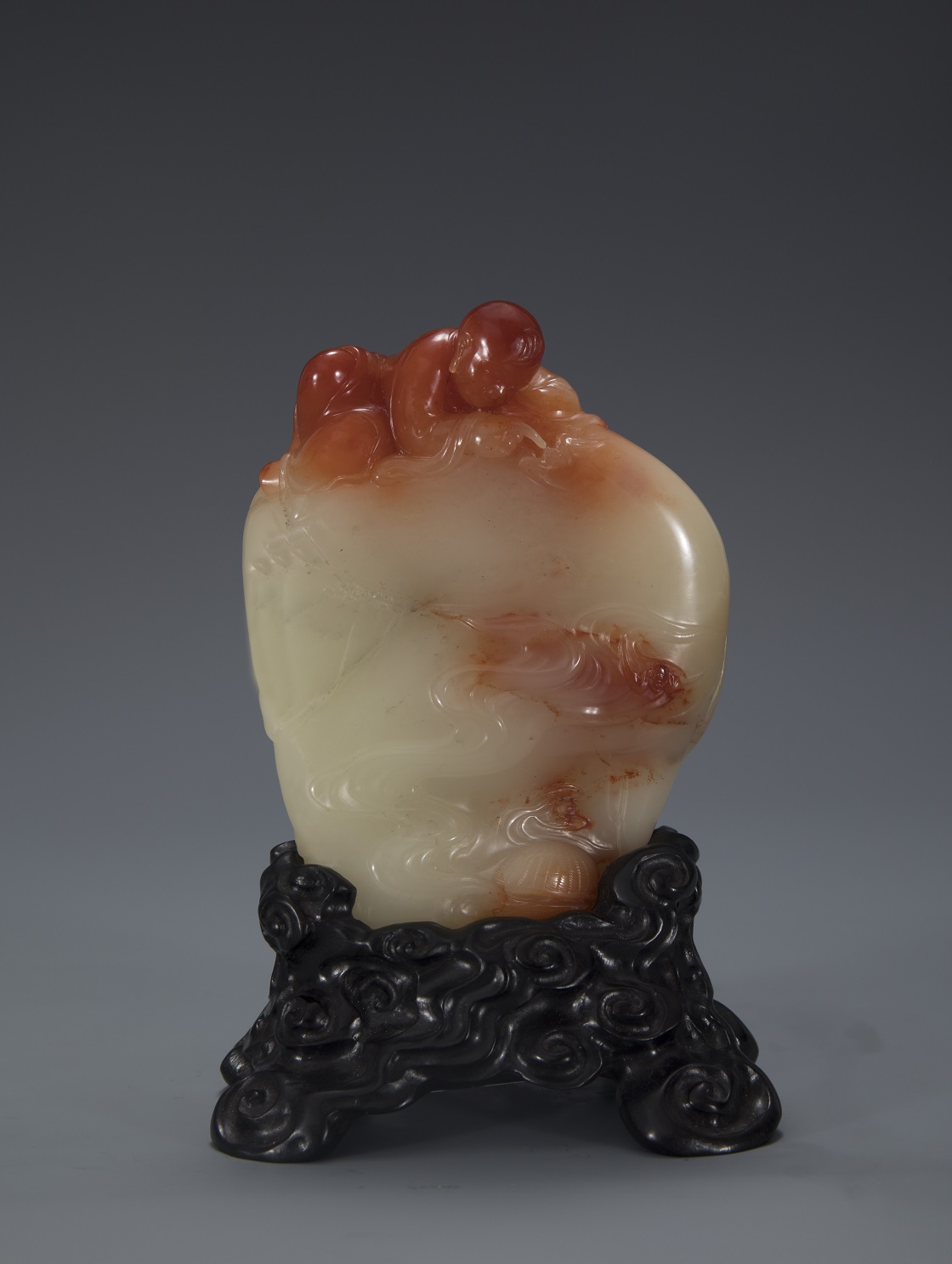 寿山石雕是以福建寿山出产的叶蜡石为原料,经过精心雕刻而成的工艺品。寿山石雕造型有着人物、花果、动物、山水风景、印章,为福建工艺品“三宝”(脱胎漆器、寿山石雕、角梳)之一。寿山石历经逾千年,以它独特的意蕴,构成了内涵丰富的“寿山石文化”。而寿山石文化又与中国传统的诗、书、画文化内涵密不可分,自古至今,许多文人雅仕都将自己的情感寄托于寿山石的意境之中。郑幼林自觉承续石雕传统题材与技法,并将其他雕刻手法、造型方式与审美追求融入创作,不断探索新的技法。 《福在眼前》利用石材原本的色彩分布巧妙地将顶端和中间些许的红色雕刻成幼童和蝙蝠,白色部分设计成云海。蝙蝠在幼童前飞舞,寓意主题。作品体现了“精致和谐、美善统一”的人文价值,不仅仅包含刀工技法,更充满了精神上的感染力,给人赏心悦目的享受。